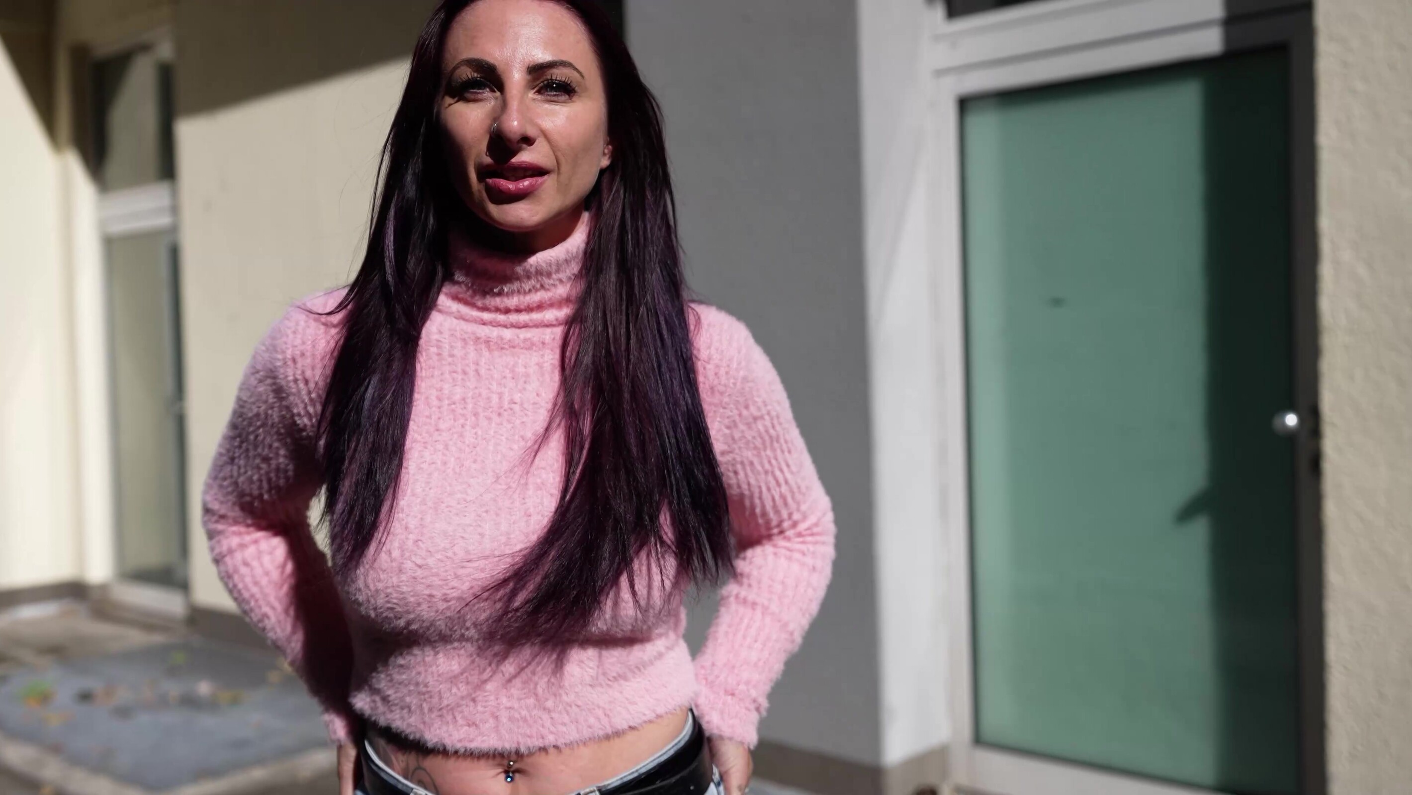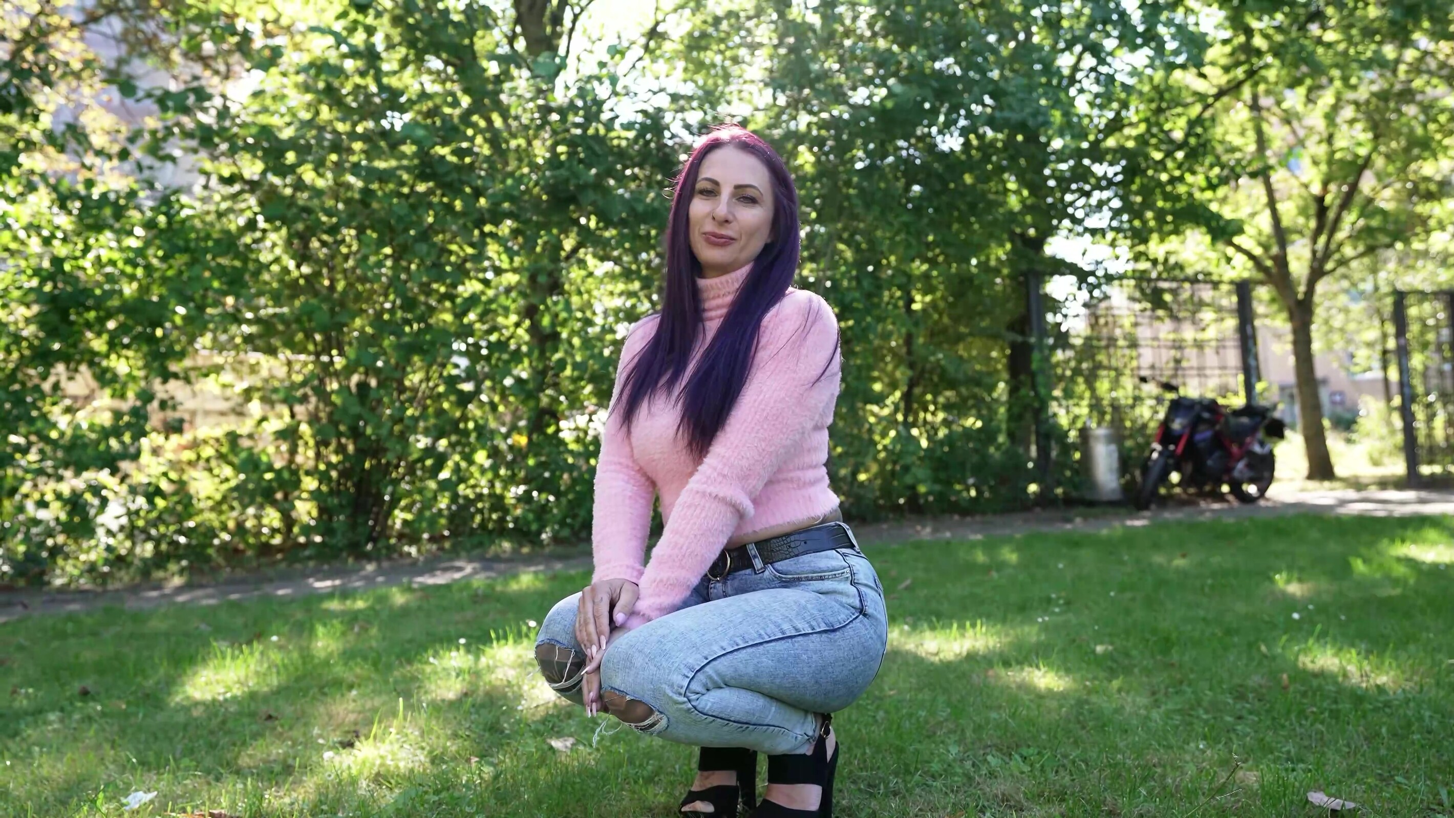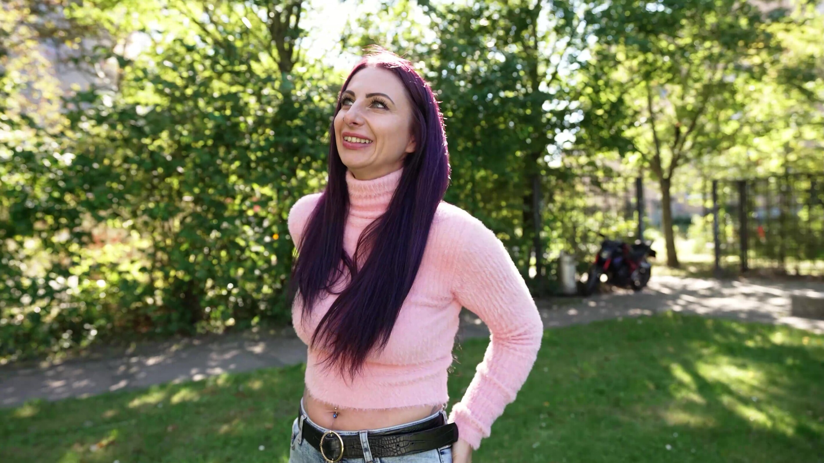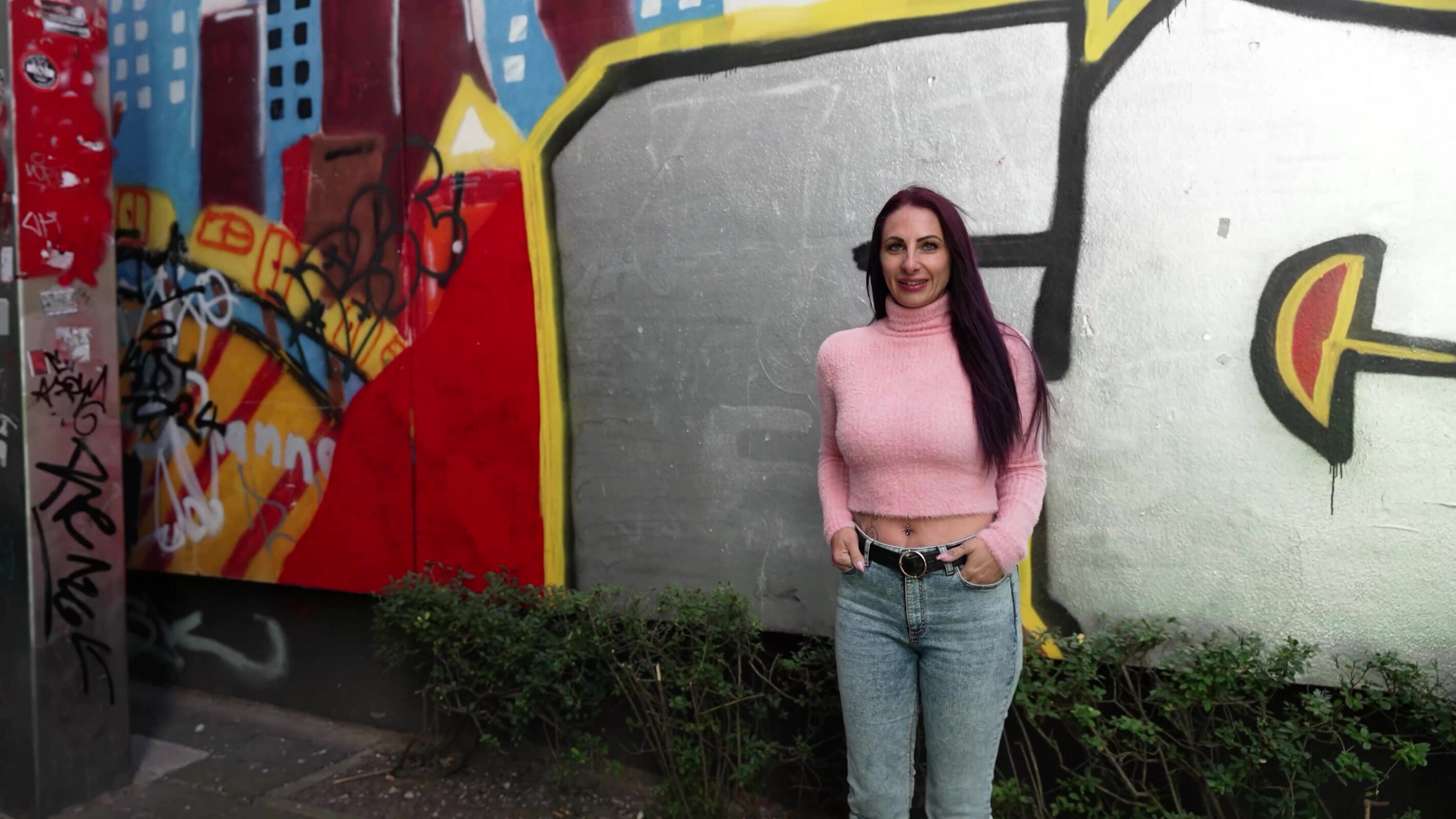 Het viel me meteen op dat ze lang paars haar had en ik kon veel zien in haar strakke trui en spijkerbroek. Dus ik stapte direct op haar af en we raakten snel aan de praat. Ze komt eigenlijk uit Würzburg, maar wil naar Berlijn verhuizen. Dus we hadden snel een onderwerp en ik nam foto's van haar aan de zijkant. Ze werd snel losser en we besloten naar mijn huis te gaan. Daar konden we nog meer onthullende foto's maken.